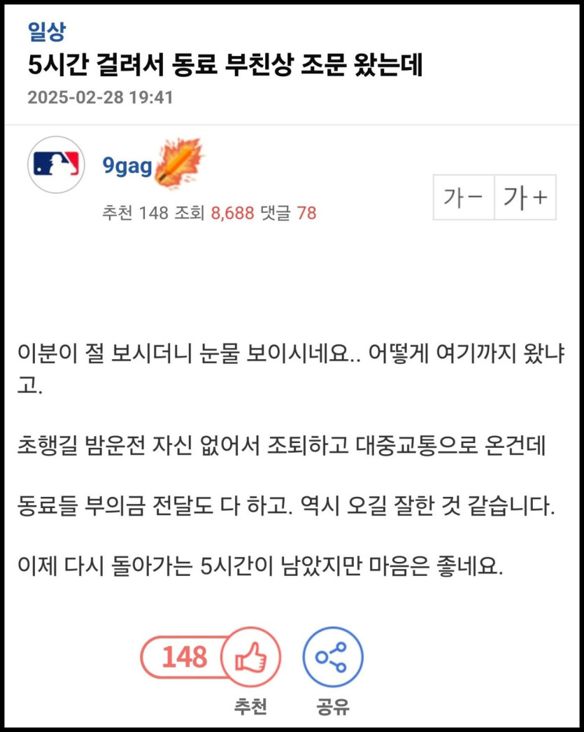 오늘 5시간 걸려서 동료 조문하러 갔는데 진짜 힘들었어 차 세워놓고 한참 걸어야 해서... 왜 이렇게 먼 거냐고